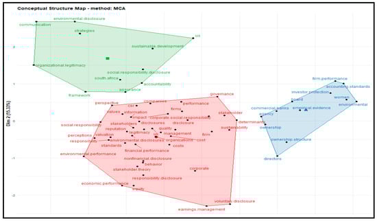 This technique identifies research trends in social accounting and its dissemination, and there are three distinct clusters (three colors). Thus, from the analysis of the keywords, it is possible to create or identify a potential conceptual structure on the subject, as shown in Figure 4.
