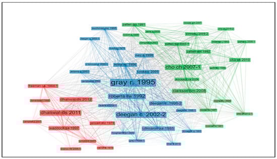 Three major groups or clusters of authors are also evident here. The first with work related to the issues of legitimacy and disclosure of information on social accounting (blue), the second with work related to the issues of disclosure of information on social accounting (green), and the third focusing on the motivations leading to the disclosure of information on social accounting.