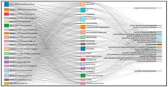 In order to visualize the existing network of scientific collaboration between academics/authors, most studied topics, and journals/journals where the outputs are published, a graph of three fields or Sankey’s Diagram (Figure 6) was used, which allows the visualization of the prominent authors, topics (keywords) and international journals where the publications were made. The representation of the network in graphic format facilitates the visualization of the interactions between the three fields analyzed. In this graph, the larger the size of the colored rectangles, the greater the frequency/importance of a given magazine, keyword, or author in the collaboration network. In addition, the links (the lines connecting institutions, keywords, and authors) vary in thickness depending on the number of links. In this context, the graph shows that themes such as “performance”, “corporate social responsibility”, “governance”, and “environmental disclosures” are the ones that generate the most significant collaboration between academics from different institutions. Among the essential authors/papers are (); (); (); (); (); (). Concerning journals, Sustainability, the Journal of Business Ethics and the Journal of Cleaner Production stand out. In terms of topics, performance studies, legitimacy, corporate social responsibility, and environmental reporting are highlighted.