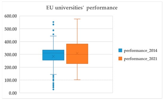 URAP provides data for 420 EU universities (universities with no data for either the year 2014 or the year 2021 have been excluded from the analysis; UK universities have been included in the analysis). Table 2 provides some descriptive statistics. Evidently, figures have been moving upwards between the years 2014 and 2021; although the maximum-to-minimum ratio has decreased, the standard deviation has increased. Figure 1 provides a graphic representation of the universities’ performance figures. It is noteworthy that in 2014, there is a significant number of outliers, but in the year 2021, there is no outlier (outliers refer to dataset figures that are extremely distant from the other corresponding figures, thus pulling the mean toward them and skewing the data; however, discarding the outliers is not risk-free and beyond critique, given that such outliers represent actual figures ()).