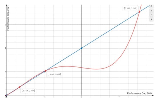 Table 3 presents the results of the econometric investigation for the emergence of convergence clubs among EU universities in terms of performance during the period 2014–2021. The estimated equation is a fourth-power equation. The dependent variable of the model is the gap in the year 2021, and the independent variable is the corresponding gap in the year 2014. The overall explanatory power of the model is quite satisfactory, and the independent variables are statistically significant (at the 1% level of significance.) Of course, considerable multicollinearity makes the choice of the best parsimonious estimation difficult. The final specification of the equation was made under the rule of dropping the statistically insignificant terms. Since more than one equation had statistically significant coefficients, the specification with the lowest Akaike Information Criterion (AIC) figure () was chosen.