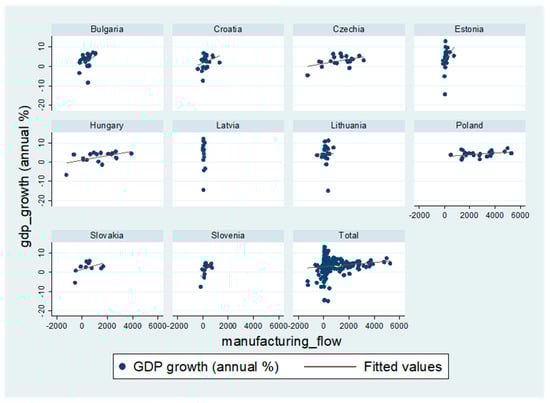 Figure 2) and the GDP growth rate (in %) in CEE countries. In the case of service sector inflows, there is an imperceptible effect of investments on the GDP growth rate, while in the case of manufacturing sector investments this effect is slightly positive, implying that such investments are export-oriented, leading to improved current account balance and economic growth.