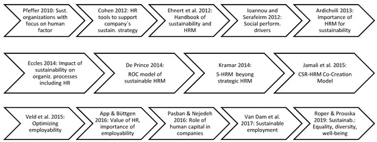 The increasing need for addressing social and HR sustainability issues and social performance drivers (Ioannou and Serafeim 2012) during the decade after the turn of the century brought about more studies published on S-HRM with focus on employees, managers and internal communication. Studies focusing on building sustainable organizations emphasized the human factor. Furthermore, employee-centered studies appeared (Pasban and Nojedeh 2016) solving various aspects of S-HRM including HR policies, processes aimed at employees to implement various strategies and organizational changes (Eccles et al. 2014), implementation of sustainability practices on the employee level, diversity, equality, well-being of employees, education, optimizing employability (Veld et al. 2015), and others. Practices of HR management and HR development were argued to play an important role in responsible behavior (Jamali et al. 2015) and sustainability implementation (Ardichvili 2013). The below diagram (Figure 1) shows some key HR sustainability studies and their topics chronologically.