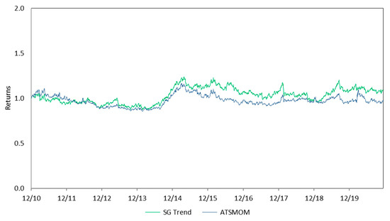 Figure 1 shows the ATSMOM factor’s time-series compared to the SG Trend Index, based on daily returns data ranging from January 2010 to December 2020. For comparison purposes, an initial level for each series is set at one (as, for example, we invested USD 1 at the beginning of the period) and then adjusted based on their corresponding returns. We found a substantial correlation of 0.7397 between two series for the sample period that confirms, in essence, that the ATSMOM factor performs as it was expected to, i.e., it follows a general, average momentum strategy in the market. The performance of the ATSMOM factor is slightly worse than the benchmark index. However, this is mostly due to the transaction costs, as we added the average transaction costs per trade in our analysis to account for practical implementation issues of the ATSMOM strategy.
