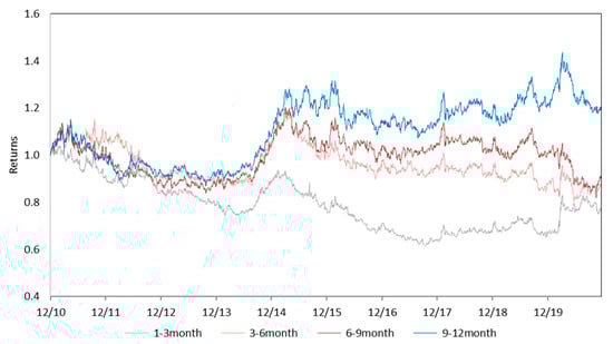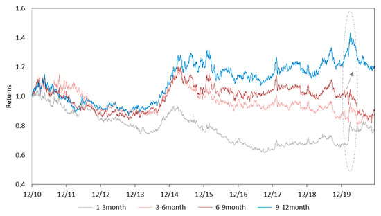Due to the flexibility of the Elaut and Erdős (2019) model, estimating and comparing momentum factors is possible based on different lookback periods. To take a closer look at the momentum factor performance, we estimate an ATSMOM series with four distinct lookback periods: 1–3 months, 3–6 months, 6–9 months, and 9–12 months (see Figure 2). The results indicate that “short-term” (e.g., 1–3 months) and “long-term” (e.g., 9–12 moth) series are often minor or even negatively correlated. For example, we found a negative correlation of −0.414 between the “short-term” and the “long-term” momentum series during the sample period from January 2010 to December 2020. The economic reasoning for this might be that the “long-term” series is more sensitive to the overall market’s general trend. In contrast, the “short-term” series represents a correcting reversal to the mean effect. This phenomenon is already documented in other financial markets. For example, Zaremba et al. (2019) confirm that, contrary to the general trend, the stocks with a high (low) return in the previous month underperform (overperform) in the following month. It is a short-term reversal effect due to investors’ overreaction, liquidity issues, institutional behavior, trading frictions, and/or transaction costs. We found this effect present in the futures market, too; contrary to a long-term momentum, short-term momentum is negatively correlated with the overall market trend.