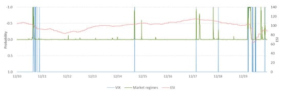We used a Markov regime-switching model to distinguish between the periods of high and low volatility in the equity market (Perlin 2015). Using daily S&P 500 Index data, we define the periods of the “up”, “intermediate”, and “down” states of economic regimes. The evolving probability of the “down” economic state is presented in Figure 5. In addition, we use the economic sentiment indicator (ESI) series available from Eurostat as a control variable to confirm periods of economic recession. Considering that volatility is singled out as one of the most critical factors in the market (Sakkas and Tessaromatis 2020), we also consider the VIX Index as a proxy for the market’s uncertainty. By definition, the VIX index measures an expected stock market volatility over the next 30 days as implied by the S&P 500 index options. Therefore, it must be strongly correlated with market sentiment and its current economic state. In general, VIX values greater than 30 are already linked to increased uncertainty and risk; therefore, we set a critical value of 30 to define the periods of significant financial distress. It seems that all indicators jointly capture critical moments in financial markets that occurred during the sample period from January 2010 to December 2020: the Black Monday in 2011 (when US sovereign debt was downgraded for the first time), the 2015 Chinese stock market turbulence, and the recent COVID-19 financial crisis.