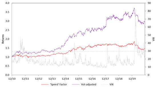 To incorporate the economic regime’s effects into our momentum strategy, we use our portfolio with the “speed” factor, as constructed in the previous section. However, we allow for the long position in both “long-term” and “short-term” momentum factors during “down” state economic regimes. As illustrated in Figure 6, the resulting time series refers that the momentum portfolio, adjusted for the economic regimes, outperforms an initial “speed” factor portfolio. Both portfolios perform relatively similarly during periods of low volatility, and the volatility-adjusted momentum portfolio always outperforms the “speed-factor” portfolio during high volatility periods.