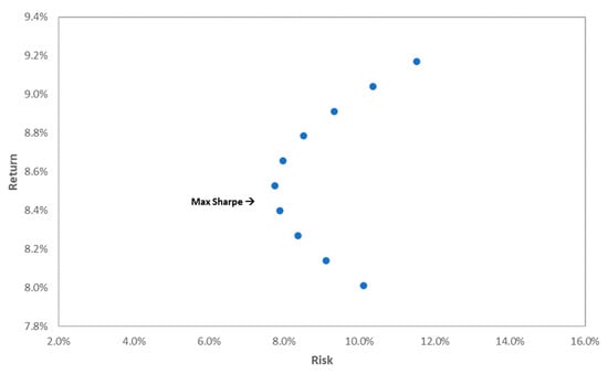 For the purpose of this analysis, we constructed some investment portfolios with 10% increasing allocations to a managed futures’ momentum exposure estimated based on the sample period ranging from January 2010 to December 2020. The analysis starts with the “traditional” portfolio as a benchmark case and adds 10% increments and a long-managed futures’ momentum exposure to the portfolio. The results for the constructed portfolios are presented in Figure 7 in an efficient frontier format. It shows that gradually increasing the allocations to momentum exposure has a positive effect on overall portfolio performance initially—it both increases total portfolio returns and decreases its standard deviations of returns.