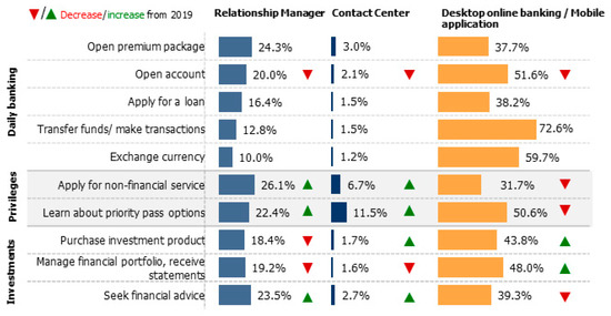 Data analysis highlights a distinct shift towards digitalization in customer interaction practices in premium banking and customers’ behavior and preferences. The results of customer questionnaires and expert interviews revealed that the premium banking customer segment shows the highest engagement with digital channels: desktop online banking platforms and mobile banking applications (Frank 2020) (Figure 2).