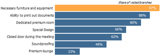 The cumulative score of the second group of parameters—“Level of comfort in a premium service area”—includes Mystery Shoppers’ subjective measures of comfort: premises design, the state of furniture and equipment, and privacy level during the meeting (soundproofing, closed doors, etc.) (Figure 4).
