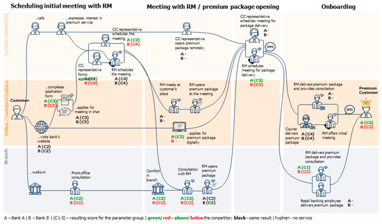 According to the Mystery Shopping methodology (Table 1), the current study scrutinizes the four main phases of a digital premium customer’s interactions with a premium bank: Phase 1—scheduling an initial meeting/consultation with the RM; Phase 2—visiting the bank branch (except for one bank in the analyzed sample that operates digitally); Phase 3—meeting front office personnel and interaction with the RM; Phase 4—premium banking onboarding procedure and the following customer experience. The research results are presented in a logical order of the interaction phases mentioned above (Frank 2020).