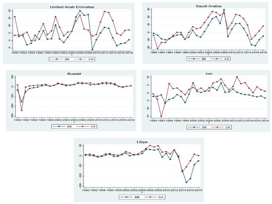 Primarily, an initial illustration of the budget balance and current account trends in oil-rich MENA countries (Figure 1) from 1990 to 2018 might demonstrate the presence of TDH in the examined countries. This is revealed by consistent periods of deficits and surpluses in both accounts. An intuitive interpretation of this result is that fiscal and monetary balances in such countries (being oil dependent) are most vulnerable to global and regional oil price shocks. A positive oil price shock results in surpluses in both balances and vice versa. Table 1 summarizes specific periods of significant oil prices shocks and the relevant impact on both budget balance and current account balance in the examined countries.