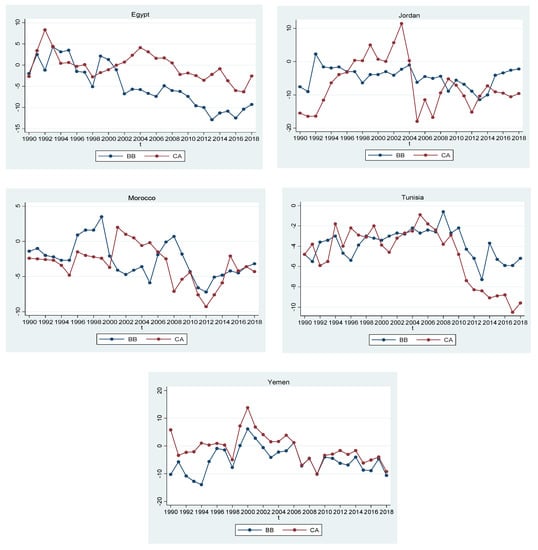 If one argues that oil dependency is a core factor causing the TDH in MENA oil region countries, then it would be expected that other non-oil dependent MENA economies would show a less prevalent twin deficit hypothesis. Nevertheless, the initial demonstration of budget balances and current account balances in those countries show different results. Twin deficits might occur in those countries due to structural fiscal imbalances as well as the high dependence on vulnerable sources of foreign currencies to finance external accounts. Such economies suffer from accumulated deficits during most of the studied period due to their dependence on other sources such as tourism, foreign aid, remittances and the adoption of pro-cyclical policies during recessions (Figure 2). Structural fiscal deficits persist due to the increased spending on subsidies and debt service. Deficits in current accounts result from poor export-driven growth, vulnerability of tourism and remittances revenues, as well as the high dependence on imported goods.