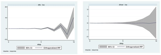 Second, after confirming the cointegration and lag selection of first order. We estimate the coefficients of this long-run relationship through GMM PVAR estimation. A positive significant relation between the two balances is found in oil-rich countries (Table 7). An increase in the budget balance by 1% results in an increase in the current account balance by 0.017%. Hence, the Keynesian proposition of the existence of a TDH is evident in oil-rich countries, where a budget surplus results in a current account surplus. The results support Eldemerdash et al. (2014), Morsy (2009) and Akanbi and Sbia (2018) for resource-rich economies and oil exporting countries. The reverse causality hypothesis—from current account balance to budget balance—is rejected as per the results presented in Table 8. This also reaffirms the unidirectional relation and supports the TDH hypothesis in oil-rich economies.