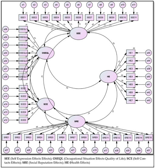 The latent variables showed different factor loadings highlighting the Health Effects with an R2 of 0.71, the Social Reputation Effects with an R2 of 0.692, the Self Contacts Effects with an R2 of 0.65, the Self Expression Effects with an R2 of 0.63, and the Occupational Situation Effects and Quality of Life with an R2 of 0.61.