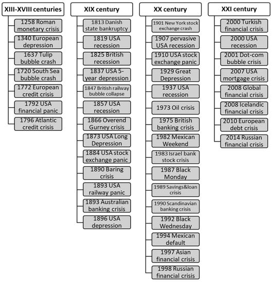 The global shortage of liquidity and presence of overvalued, low-liquid assets and derivatives on the market have led to a situation where the world economy, being primarily dependent on the amount of liquidity, became subject to successive world crises. Over the past 15 years alone, the world has experienced a continuous series of crises (). Today, market trends, as well as crises market states and bankruptcies, are the fundamental factors affecting the development of the world economy (). Therefore, the study of crisis processes and phenomena in the economy is one of the most important scientific and practical tasks (; ). Crisis is not an instantaneous and unexpected process, but, on the contrary, an inherent property of the economic system, and it has a certain rate of development. The beginning of the crisis is impossible to predict. But if the crisis has already started, one can define (register) the initial phase of the crisis. Hence, its further development can be predicted at the next stage (). The term «financial crisis» is widely used in situations where financial assets suddenly lose a large part of their nominal value. In the late 19th and early 20th centuries, a large part of financial crises was associated with bank panic. Stock market crashes and collapses of financial bubbles, currency crises, and sovereign defaults also inherently impacted financial crises. Many economists have proposed the theory of development and the prevention of financial crises.