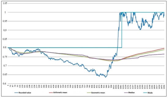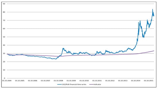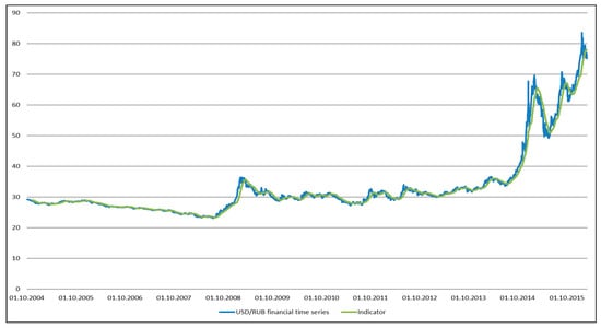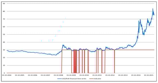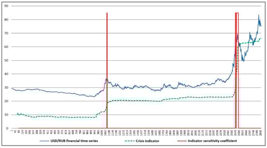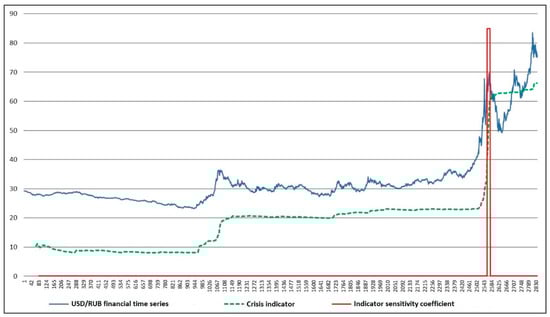 Figure 11 and Figure 12 provide an analysis of the crisis indicator operation based on the example of the time series of USD/RUB.
