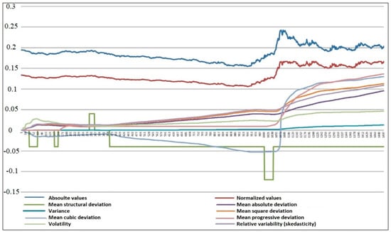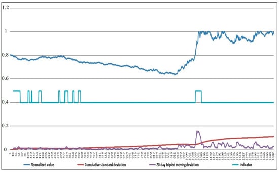 We will offer a method of constructing a crisis indicator that defines the crisis at an early stage. The method of creating a crisis indicator is based on the key empirical properties of volatility. Relying on the three-sigma rule (), stating that practically all of the values are normally distributed random variables lying within the interval, [M − 3σ; M + 3σ] asked to assess the crisis as the output volatility index for statistically predictable limits. In this case, it means that the distribution of the time-series volatility is close to normal. Thus, the beginning of the crisis is changing the basic indicator (asset volatility) beyond the predictable probability (statistically in 99.7%). Therefore, as a crisis indicator, the integrative assessment of triple error volatility can be used, the benchmark for which is the current value of volatility where means the volatility of fluctuations ().