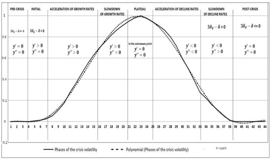 The econometric model of the crisis development may include six stages characterized by the first- and second-order derivatives of the approximating function of the standard deviation of volatility . Table 1 shows the stages of the crisis development.
