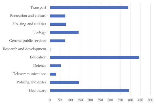 Analysis of the data in Figure 1 shows that, in 2018, the most successful PPP experiences were in healthcare (393 projects) and education (443 projects), as these are the areas in which the mechanism is most often applied. Additionally, the overall distribution of projects across all countries shows that a large number of PPP projects are being applied in the transport sector (391 projects).