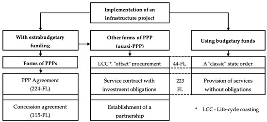 Concerning the domestic experience in implementing PPP mechanisms, this mechanism was actively developed in modern Russia in the early 2000s, but for a long time this area had no definite legal and regulatory framework, making its application difficult. Frequent disagreements between public and private partners as well as a lack of any guarantees for free investors reduced the investment attractiveness of this form of cooperation between the state and business. In 2005, a legal and regulatory framework began to evolve, the provisions of which regulated the procedure of interaction between public and private agents in the framework of the development of infrastructure projects. In this context, it identified the range of available tools, involving both extra-budgetary funds and the use of public resources (see Figure 2).