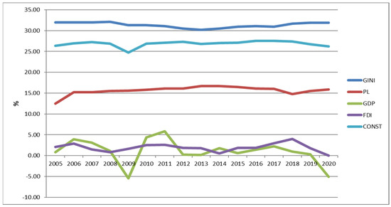 FDI dropped sharply in 2008 and 2012 to −10%, and to −5% in 2020, as shown in Figure 1. GINI was resistant to crises and increased gradually. The PL showed a rise (2–3%) in the most difficult years of 2008–2009 and only slightly decreased (1%) in 2020. The GDP was the most sensitive indicator to crises (−5% in 2008–2009, and −5% in 2020). Thus, since most of Denmark’s financial assets were diversified into household balance sheets, the GINI and PL levels did not decline during the crises. CONST was also crisis resilient as long-term investments were involved there. As a result, only external investors reacted to the crises by reducing the flow of FDI. This had a serious impact on the GDP.