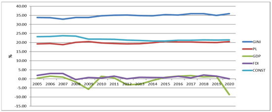 We collected annual GINI, PL, GDP, FDI, and CONST data for Denmark, Italy, Germany, Romania, China, India, and the Russian Federation for 2005–2020. All series were reduced to percentage indicators: GINI—ratio of rich and poor, PL—poverty headcount ratio at national poverty lines (% of population), GDP—dynamics (change from the previous year), CONST—percentage of construction investment of GDP (Table 1).