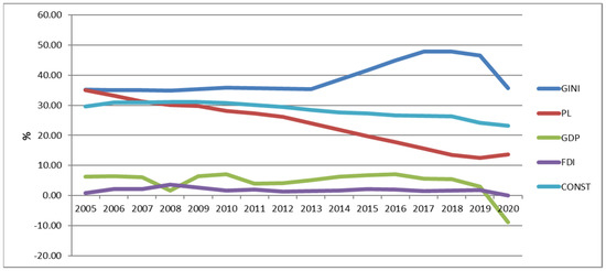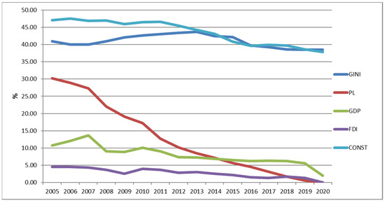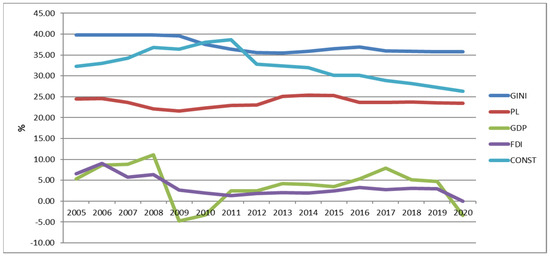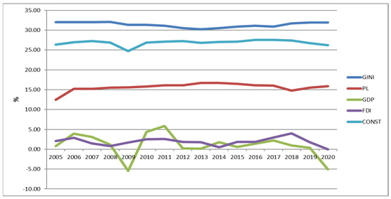 The construction sector investments in 2005–2020 accounted for a significant share of the GDP at 25–30%. Thus, in a linear relationship, we did not observe a change in poverty based on FDI and investment in construction, but cause-and-effect relationships recorded a change in PL and GDP.