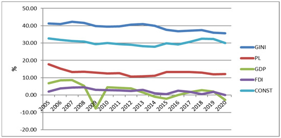 We conducted testing in two stages. In the first step, we compared GINI, PL, GDP, FDI, and CONST. The first step showed that the PL is more susceptible to change and dependent on the GDP, FDI, CONST than GINI. In the second stage, we considered the dependence of the PL on GDP, FDI, and CONST. We showed results. The unit root tests and a set of robustness analyses are not reported here but are available from the authors upon request.