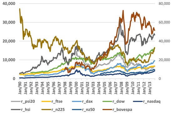 Figure 1 shows the evolution of all the indexes from 1990 to 2013. All show a growth trend, except the N225. BOVESPA, the only index using the second Y-axis scale, had by far the most positive performance. Note that all index data clearly show the dotcom bubble ending late 2001 and the financial subprime crisis in late 2008.