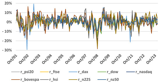 Figure 2 below shows all nine indexes’ monthly returns, where data stationarity can be observed. Moreover, for each index, a monthly return Dickey–Fuller test for unit root was performed without evidence of autocorrelation.