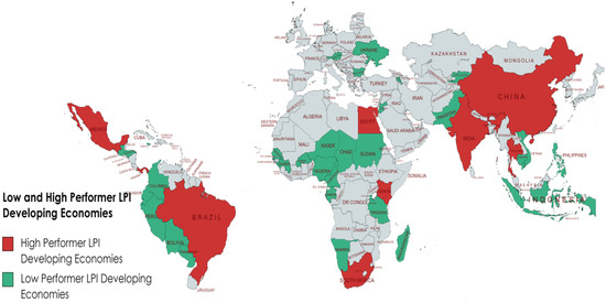 The Selected High and Low Performer LPI Developing Countries on World Map.