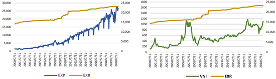 Data for this study were obtained from two sources. Monthly data of the export value (EXP) and VND/USD exchange rates (EXR) of Vietnam were obtained from the database of the International Monetary Fund (IMF) from 31 July 2000 to 31 December 2020. The monthly data of VN-INDEX (VNI) were taken from Vietstock in the same period.
