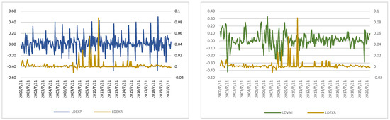 Let denote the vector of EXP, EXR, and VNI. Then, yields the annual growth rates after taking the differences of its logs: