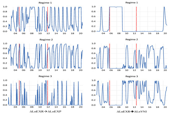 Figure 3 is the plot of the smoothing probabilities of the triple regime model that explores how exchange rate growth affects export growth and stock returns. The plot of exchange rate effect on export growth (ΔLn_EXR →ΔLn_EXP) shows that both the red vertical dashed lines at June 2005 and May 2012 are in Regime 2. The highest volatility period was 2008–2009, which coincided with the global financial crisis. This high volatility carries high export growth caused by the depreciation of VND one year earlier.