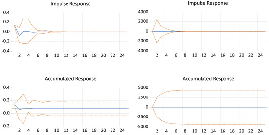 Figure 4 plots the impact of the risk generated by the exchange rates on the export and stock market. It shows that the shock of exchange rates on export is negative, then becomes positive, and slowly diminishes. This implies that the exchange rate first makes the export decrease then slowly rise with a small magnitude, and disappears after 12 months. From the impact on the stock market, it can be found that the effect is not significant and then slowly disappears after 6 months.