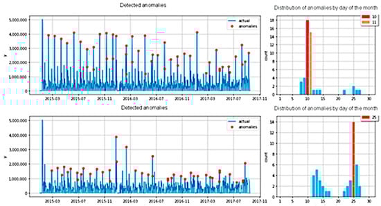 The distribution of anomalies by days of the month for a given series is shown in Figure 4. Visualizations built using the SHAP library were used to display the influence of variables on decision-making using an algorithm in a business-friendly language (Baptista and Poloczek 2018). This method facilitated the display, in an accessible form, of the influence of variables on decision-making. At the same time, the decisive variables can be displayed in an accessible way for each device on a specific day.