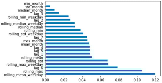 When selecting features, cross-validation was used for the time series, the central meaning of which was sequential movement along with the time series, increasing the training sample. In this case, the number of folds for dividing the sample was taken as being equal to five. As a result, we obtained a histogram of the importance of features, where the x-axis was the contribution and influence of each feature on the forecast, and the y-axis lists the features that affected the forecast (Figure 2).