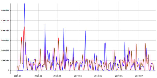 Comparison of actual and forecast values using a time series of demand for cash in one of the ATMs (blue—actual values; red—forecast).