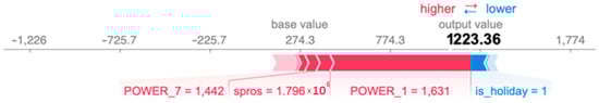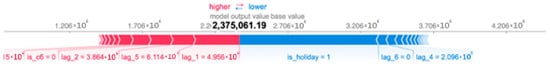 Based on the graph, it can be seen that the following factors influenced the increase in the forecast demand: the day of the week is Saturday, not a holiday, there was an increase in demand seven days ago, the indicator predicted this was a day of massive payments (abnormal demand).