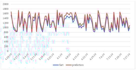 It can be seen from the graph that the fact that May 1, 2019 is a holiday (the value of the is_holiday attribute = 1) played in the direction of decreasing (blue) the predicted load (Figure 7).