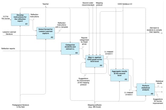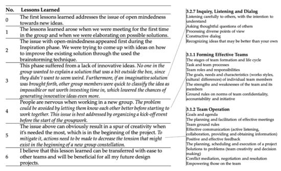 LL are of great importance in engineering design and product development. These are recognized as highly knowledge-intensive activities, and LL are useful means to turn tacit knowledge to explicit (see [23]), to share experiential knowledge across time and space [24], and to reuse it from one project to another [25]. Several templates are proposed to capture LL and contextualize them in real work activities to support decision-making (e.g., [26]). These templates commonly feature a section dedicated to background information on the project, as well as an abstract, a description of the conditions for reuse, other relevant details and useful references. The template used to capture LL from the students in the course project is adapted from that proposed by Chirumalla et al. [27] in the aerospace sector and Features 7 main steps (Table 1).
