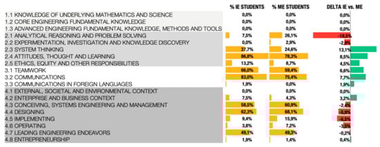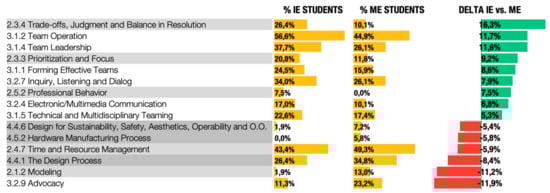 The analysis was further detailed by clustering the students based on their enrollment in a study program in order to determine the existence of a statistically significant difference between different students’ backgrounds. A limitation in such analysis was posed by excluding the students enrolled in the master of Sustainable Product-Service Systems Innovation, given their limited number, and by excluding the exchange students due to the high heterogeneity of background in their group composition. The presence of differences between the two remaining independent groups (i.e., the students in Mechanical Engineering, and the students in Industrial Engineering and Management) consisted in verifying if the lessons learned identified were set irrespectively from the type of the group. The results of this analysis at the second level of the CDIO Syllabus are shown in Figure 7. This displays the ratio of students as % of the total from each program that refers to a specific CDIO goal, as well as the positive of the negative delta between the IE and ME groups.