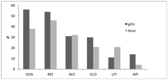 The environmental relationship of girls (n = 63) and boys (n = 48) with the landscapes they wanted to conserve. The percentage of respondents belonging to each thematic group is given. CON = concern; RES = responsibility; AES = aesthetic values, CCO = cause and consequences; UTI = utilitarian values; and AFF = affection for the landscapes.