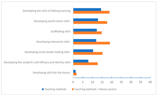 General teaching and learning skills (Figure 2) were expressed 636 times as ways to support SD in geography, such as developing skills of lifelong learning (expressed in 19%) and global citizen skills (18% of all expressions). Developing skills for the future was found in only in 2% of the articles about promoting SD in geography. The others were scaffolding, developing interactive skills, developing multi-modal reading skills, and students’ self-efficacy and identity.