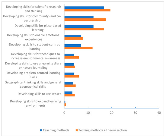 Teaching and learning skills in geography (Figure 3) were identified 504 times in the articles about promoting sustainable education, including outdoor education. Among the most often expressed were the skills of scientific research and thinking skills (19%), developing community and co-partnership skills (17%), and place-based learning (17%), and less often mentioned were the general geographical thinking skills and general geographical skills (5%), the use of the senses (4%), and expanded learning environments (<1%).