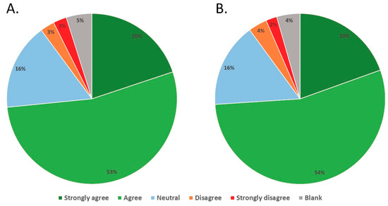 Students’ response to “Overall, I think the group activities are worthwhile and I would recommend continuing them for future semesters”. (A) Students’ responses from the whole course. (B) The responses of the 19 groups selected for this study.