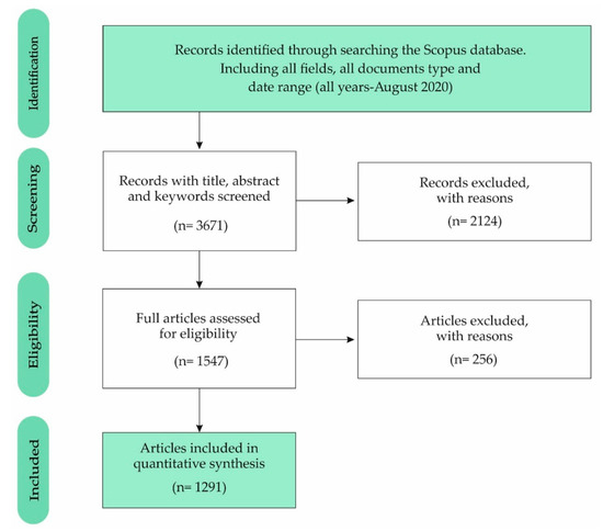 The process followed in the selection of the sample conforms to the flowchart of Figure 1, according to the Preferred Reporting Items for Systematic Reviews and Meta-Analyses (PRISMA) [73]. In phase 1 (Identification), 107,365 records from the Scopus database were identified, considering all the fields for each of the key search terms (education, art, visual, and digital), all types of documents, and all data in the range (all years—August 2020). Search terms were identified from the initial literature review. In phase 2 (Screening), the option of “article title, abstract, and keywords” was chosen in the field of each term, so that 103,964 records were excluded. Subsequently, in phase 3 (Eligibility), of the 3671 records, only articles were selected as the type of document, to ensure the quality derived from the peer-review process. In this phase, 2124 documents were excluded. In the last phase, phase 4 (Included), of the 1547 records, 256 documents were excluded, by limiting the period analyzed from 2000 to 2019, and excluding the thematic areas that distorted the sample. The final sample included 1291 articles, both open access and non-open access.