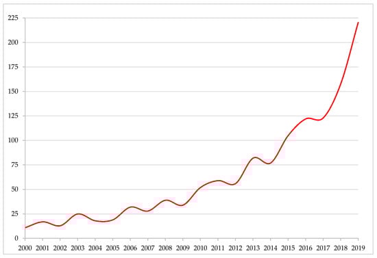 It is noteworthy the considerable increase in the number of articles published in the last 3 years (2017–2019), from 123 articles to 221, assuming a percentage increase of almost double (7.79% to 14%). The total number of publications in this triennium is 502 articles (38.88%).