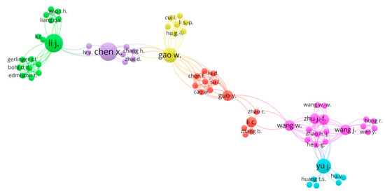 Cluster 1 (pink) presents the collaboration between He, X.; Hong; Hu; Lu, H.; Tong; Wang, J.; Wang, M.; Yang; Zhao; and Wang, W.; among others. Group 2 (green) groups Bohl; Campbell; Edmiston; Gao; Gerlinger; Khorsand; Li, J.; Li, R.; Liang; Liu; Louie; and Mikhail; among others. Cluster 3 (red) contains a number of authors, including Cao; Chen; Cui, D.; Guo, Y.; Jiao, Q.; Lu, D.; Lu, G.; Li, C.; and Xiao, Q. Cluster 4 (yellow), among others, groups Cui, L.; Gao, W.; Hu, G.-L.; Zhang, Q.; Zhang, Z.-H; and Lan, Y.-J. Cluster 5 (purple) is made up of authors Chang, H.; Chen, X.; Cui, B.; Guo, M.; Liu, X.; Zhai, D.; and Zhen, Y. Finally, cluster 6 (cyan) is made up of Hu, Y.; Jiang, W.; Luo, J.; Huang, T.S.; Peng, R.; Yang, J.; and Yu, J.